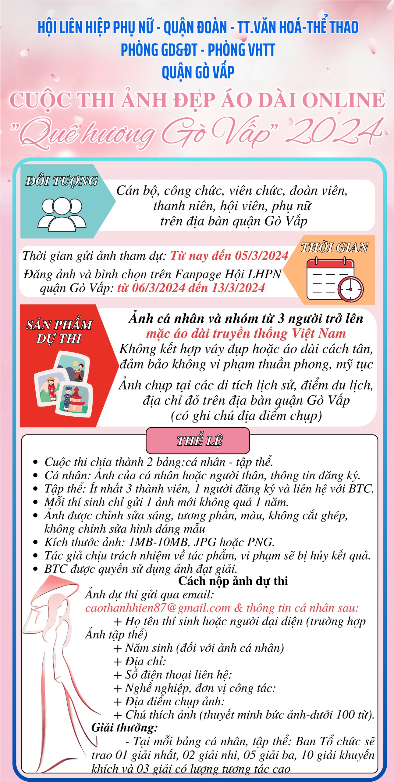 Kế hoạch phối hợp số 165/KH-HPN-QĐ-TT.VHTT-VHTT-GDĐT ngày 19/02/2024 về tổ chức cuộc thi ảnh đẹp Áo Dài online chủ đề "Quê hương Gò Vấp" năm 2024