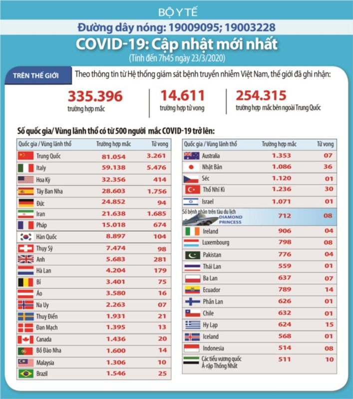 - Thế giới 335.396 người mắc, 14.611 người tử vong, trong đó: